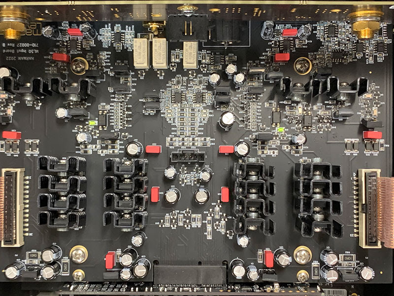 Одной из самых впечатляющих особенностей ML-50 является качество звука. Это начинается с входной схемы. Новая плата ввода была разработана с запатентованной полностью дифференциальной (симметричной) схемой, которая включает усовершенствованный метод повышения симметрии выходного напряжения, снижения искажений и улучшения общей стабильности. На этой плате используется множество отдельных радиаторов на транзисторах меньшего размера, чтобы обеспечить стабильную и надежную работу в течение многих лет непрерывной работы. С этой улучшенной и невероятно чистой входной схемой мы сосредоточили наше внимание на выходном каскаде.